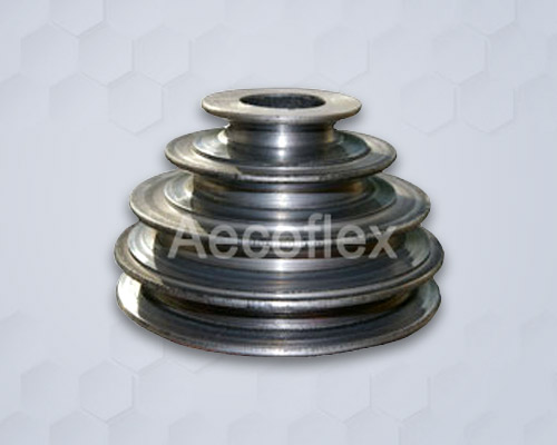 A series of pulleys of various diameters combined in a single concentric unit is knows as step pulley and used to vary the velocity ratio of shafts. Step Pulley is used where variations are required from slow rotations to high rotations with change of torque. It is also known as cone pulley.